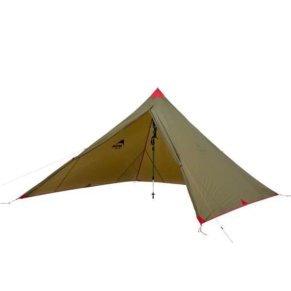 So vielseitig wie ein Mid, so sind auch die Aufbauoptionen. Für die Mittelstange kannst du deine Trekkingstöcke, einen Ast oder eine Tarpstange nutzen. Selbst der Aufbau ohne Mittelstange ist möglich, da das Zelt auf der verstärkten Oberseite eine Gurtbandschlaufe besitzt, durch die du ein Seil ziehen kannst. So lässt es sich zwischen zwei Bäumen nach oben abspannen.