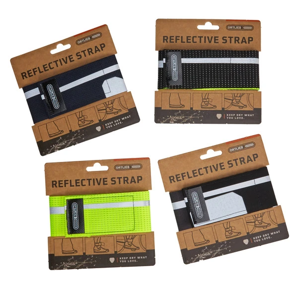 Reflektierendes Klettband, das deine Hose vor Schmutz schützt und dich im Straßenverkehr besser sichtbar macht. Der Reflective Strap wird aus Geweberesten hergestellt, die bei Ortlieb anfallen.