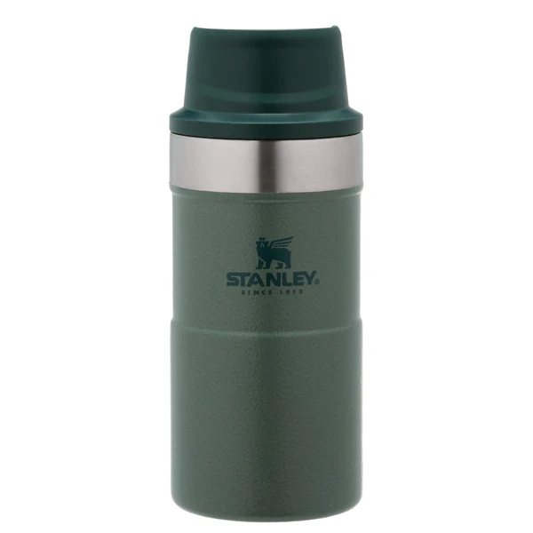 Optisch im klassischen Stanley-Look, technisch auf der Höhe der Zeit. Der Becher kann einhändig per Tastendruck geöffnet und verschlossen werden.